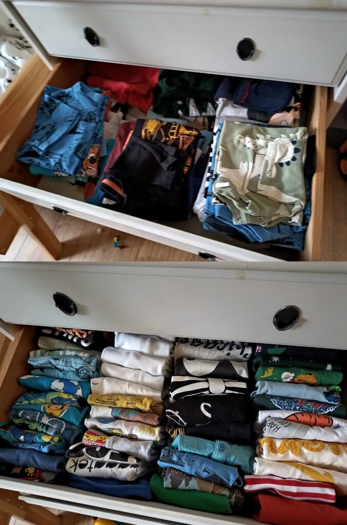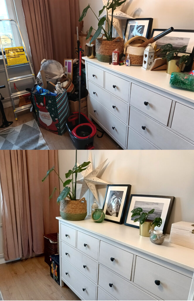 Mnie urzekła szybkość wykonania usługi – spodziewałam się pół dnia pracy, a właściwie całość zajęła niecałe 2 godziny. W zamian odzyskałam psychiczny spokój, kiedy wchodzę do pokoju i otwieram komodę, bo wiem, gdzie co jest, i wiem, gdzie co odłożyć. To dla mnie bardzo istotna kwestia, bo bałagan powoduje u mnie zawsze złe samopoczucie. Dodatkowo jestem zainspirowana dalszymi porządkami i organizacją mojej przestrzeni, żeby żyło się lepiej. Bo też nie chodzi o to, żeby się wszystkiego pozbywać – czasami pewne rzeczy są nam potrzebne rzadko, a nie chcę ciągle kupować, więc wolę trzymać w domu. Jeśli zrobi się to odpowiednio sprytnie, to znajdzie się na to miejsce nawet w małym mieszkaniu 🙂